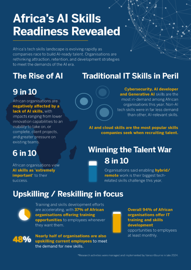Every organisation that was surveyed as part of the research said they expect the demand for AI skills to increase in 2025. All companies also expected to experience some AI-related skills gap this year. “Skills related to AI are hugely in-demand among African organisations, with 85% saying AI development skills are a priority, and 83% prioritising Generative AI skills. To help close the AI skills gap, two-thirds of organisations are introducing career development initiatives with AI specialisation to upskill or reskill employees.”