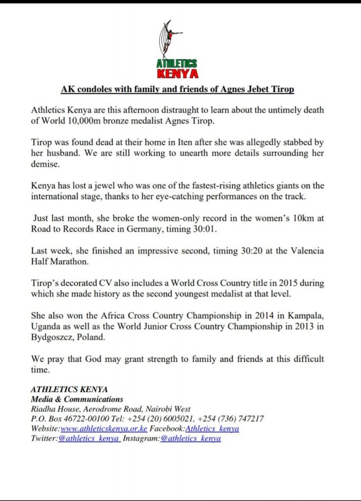 Athletics Kenya (AK) has sent out a message of condolences to the World 10,000m bronze medalist Agnes Tirop.