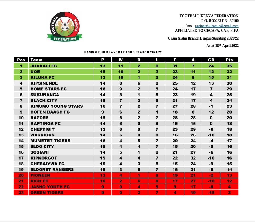 Jua Kali FC is top of the Uasin Gishu Branch League with 35 points after playing 13 games. UOE is second with 32 points after 15 matches played while Kiluka FC is third with 31 points having played two games less than second-placed UOE.