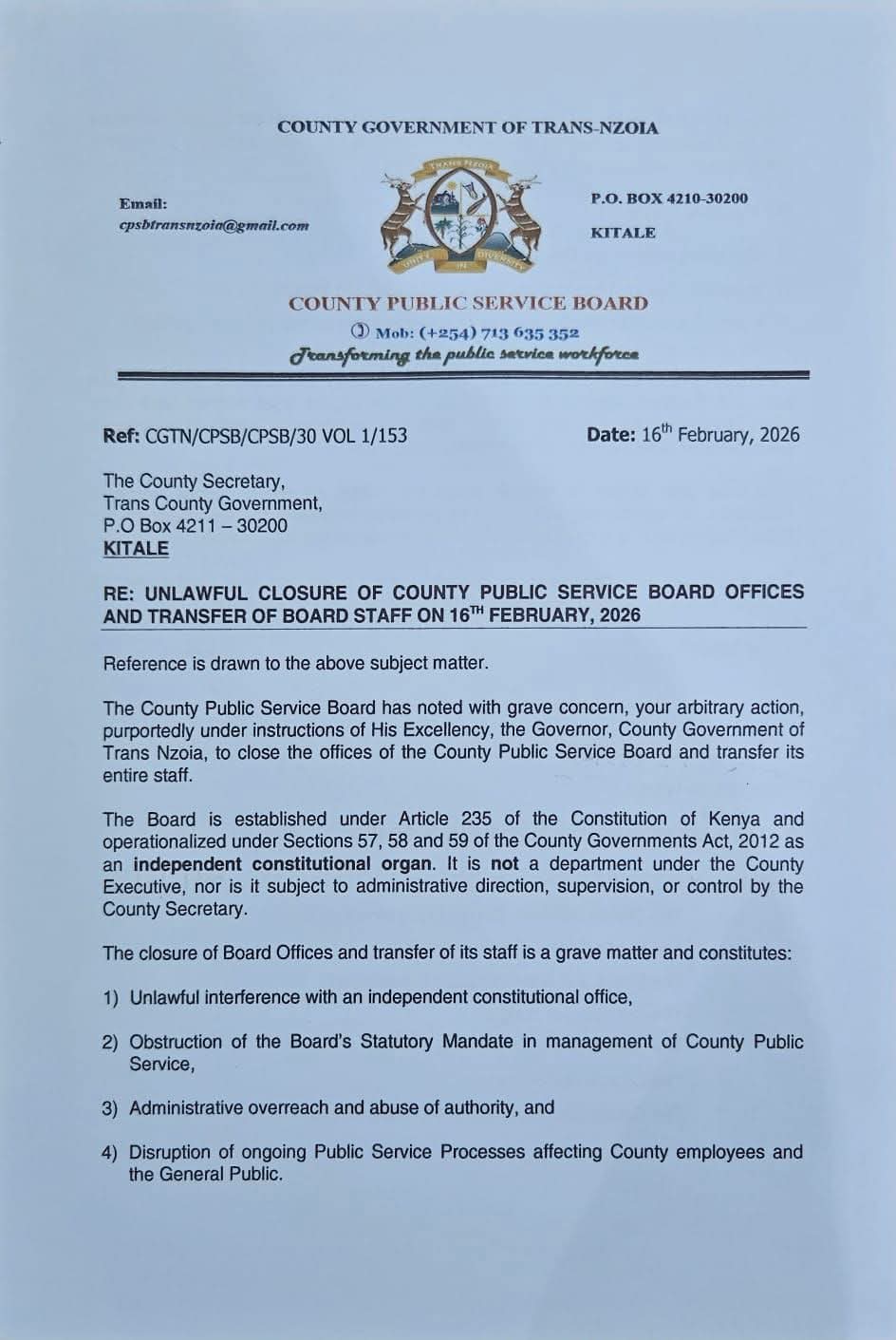 In a press release dated February 16, 2026, Governor Natembeya stated he had officially ordered the closure of the offices and operations of the board until March 2, 2026.