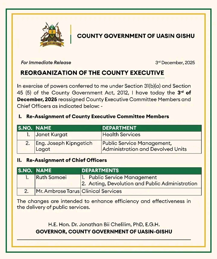 Uasin Gishu Governor Jonathan Bii Chelilim has announced the reorganization of his county executive.