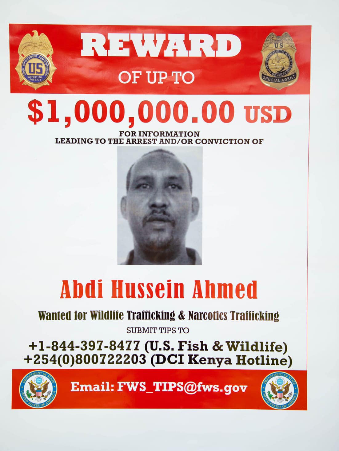 Ahmed’s arrest follows the arrest of his accomplice Badru Abdul Aziz Saleh, alias “Badro” on May 31, one week after a reward of $ 1Million USD was announced by the U.S. Department of State, through the Transnational Organized Crime Rewards Program (TOCRP) for information leading to the arrest and/or conviction of Abdi Hussein Ahmed, for participating in transnational organized crime, i.e. narcotics trafficking.