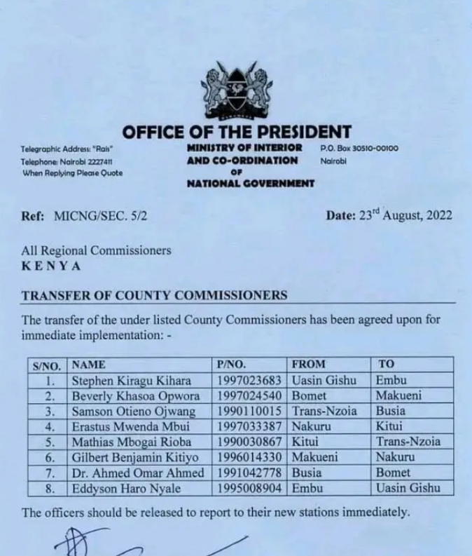 And according to a letter dated August 23, 2022, Kihara has been moved from Uasin Gishu to Embu.